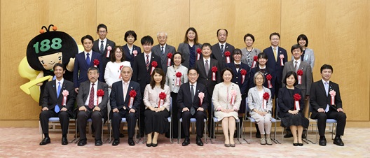 表彰式では、岸田内閣総理大臣と、内閣総理大臣表彰及び内閣府特命担当大臣表彰の受賞者に表彰状を授与しました。